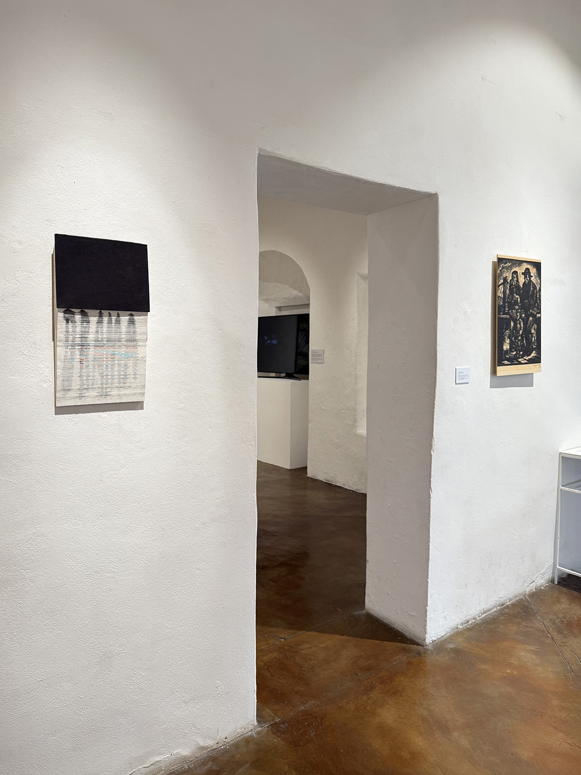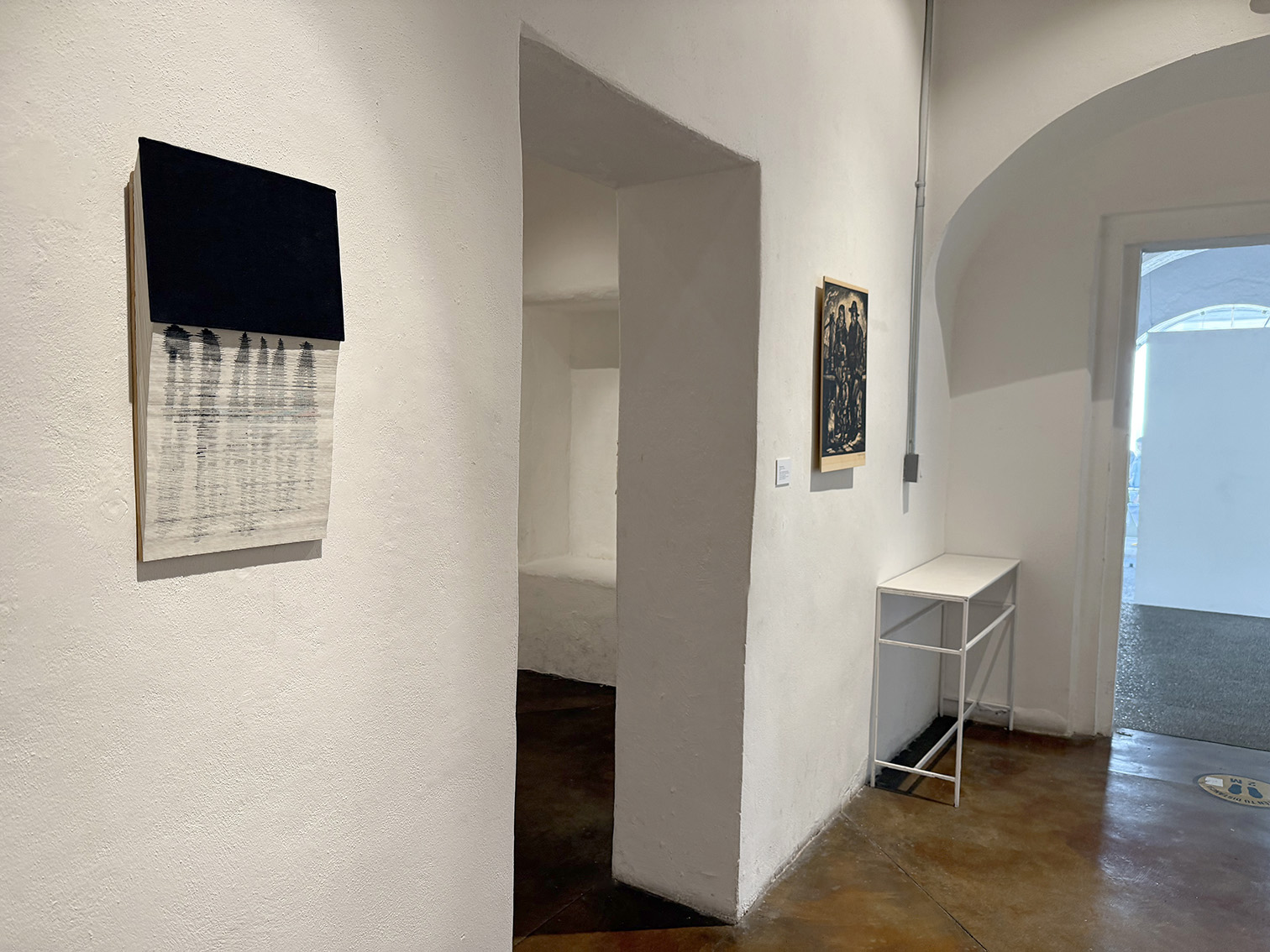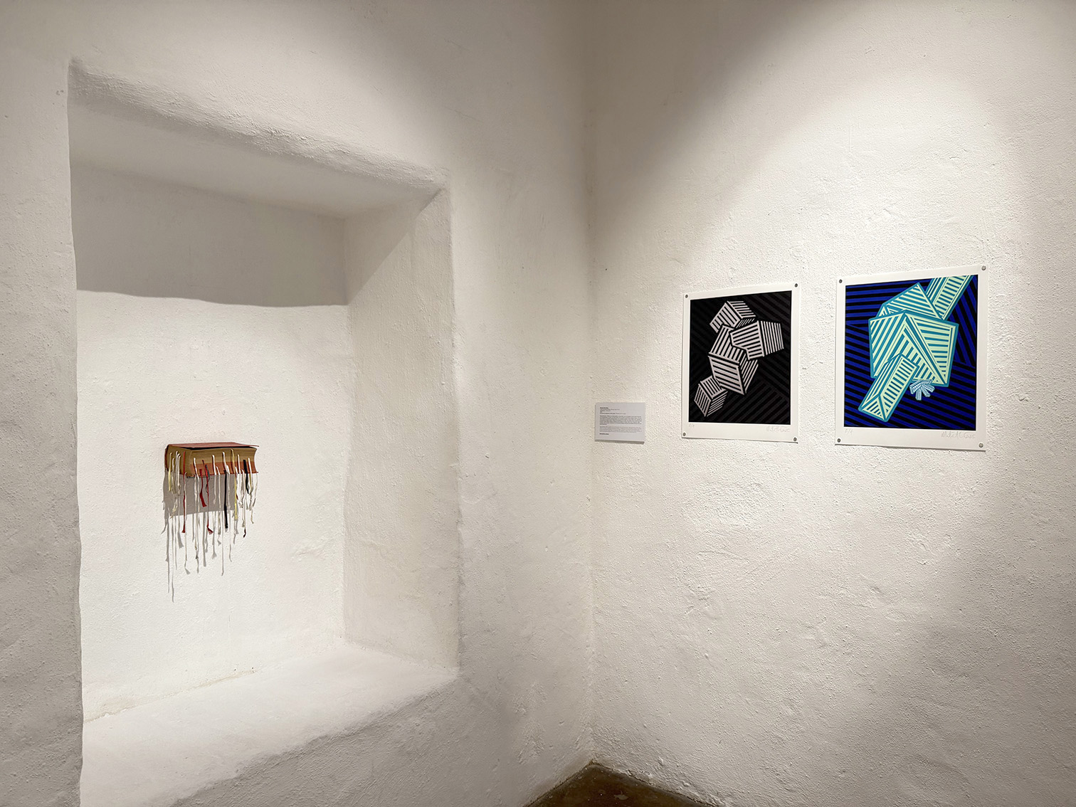 A series of three graphics by Róbert Makar conducts an illustrated dialogue on the trajectory of Koloman Sokol's life in the 1930s, and the triangle which his life was played out: Mexico – Czechoslovakia – USA. De-construction of K.S. is a series of digital drawings in which the author freely reinterprets Koloman Sokol's 1929 portrait to explore the influence of the forces of fate. Matúš Maťátko's graphic series references the composition of the various non-ferrous metals and minerals which were extracted from mines across Slovakia. The mining industry, a field which has long been associated with the enrichment of the powerful through the exploitation of the powerless, has played a significant role in the historical development of Slovakia. Using refined forms, the artist posits Platonic solids as the foundation stones of the structure of the world. Viktor Fuček's video performance The Fate of Our World functions as an allegory of the woven pattern of the world, reflecting the ways in which power elites continually disrupt the fragile stability of communal living through their egocentrism, thereby reshaping the delicate fabric of reality for their own benefit. As Donna Haraway emphasizes, some Navajo thinkers understand rope games as a means of restoring the balance between human and non-human beings. The natural world is the main theme of Juliana Mrvová's paintings and drawings, an artist who combines lyricism with an exploratory gaze to transform personal reminiscences into layered compositions that reveal the fragility of the world and the crucial role of transience in the cycle of life. The young artist Michaela Šuranská analyzes landscape as a temporally layered entity modified by human activity in painting and its extensions. She repeatedly returns to the same places to record the subtle changes which they have undergone, seeking to initiate a search for the deeper roots of memory. Her work calls upon us to slow down and sensitize ourselves to the places in which we currently find ourselves. An ongoing focus of the work of Martin Derner has been an exploration of the objects which surround us as part of an effort to reassess their functions and instill them with new conceptual values. His works exhibited here use books as a found material, with the artist manipulating the objects to elicit broader meanings; the book emerges as a collection of knowledge and stories that co-determine our decisions and, in turn, our fate. Stano Masár is also a conceptual artist whose artistic practice also works with everyday objects, reconstituting them into new positions of existence, often by incorporating the element of time and its representation. In his work Time Off, he deconstructs a wall clock by stripping it of its ability to tell time, thereby generating a new reality that opens up space for reflection, questioning how we perceive the world and seeking answers to the fundamental questions of existence. The intermedia artist Boris Vaitovič often relativizes conventional thinking patterns and their visual representations in his work, and this is apparent in his painting titled Dispersion of Humanity, which depicts humans as universal beings across time and space.